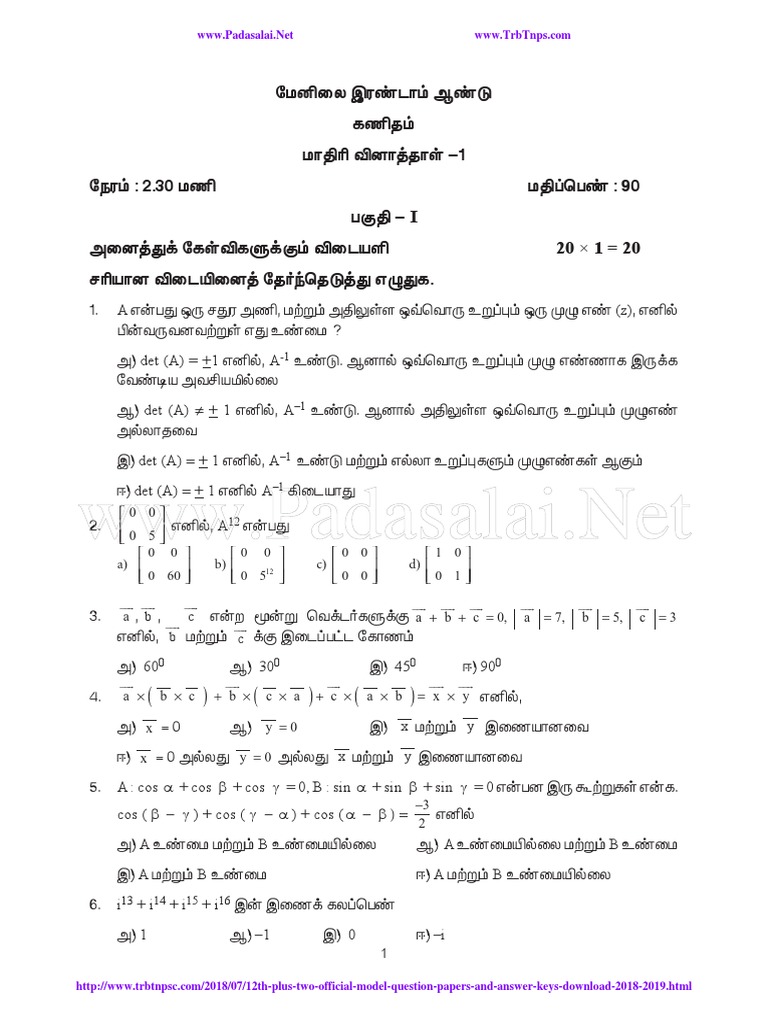 12th Maths Public Exam Official Model Question Paper 2018 2019 Download Tamil Medium